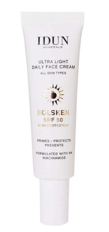 IDUN Minerals Ultra Light Daily Face Cream Solsken med SPF50 er en fugtighedscreme. Primer og høj solbeskyttelse i t.